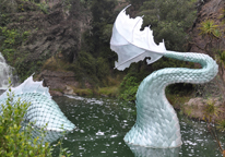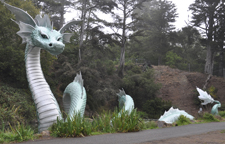 | This 100-foot-long Sea Serpent was installed in 2025 in the Rainbow Falls pond in Golden Gate Park. It was created in 2024 by a team of artists and volunteers from Burning Man as "Naga & the Captainess." The metal sculpture is lit at night. At Burning Man, the sculpture included a shipwreck. For more, see these websites: 1 and 2. [map] |