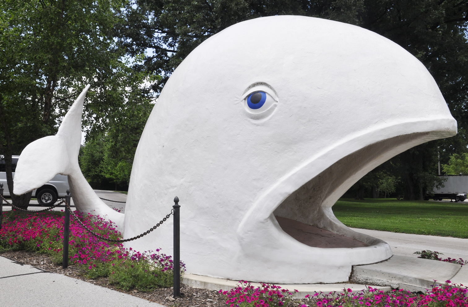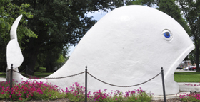 | Willie the Whale was built in 1964 by Richard Kishel's Art Forms Workshop in Muncie. The whale is 26 feet long and his blowhole originally sprayed water. He was originally installed in a pond at the Washington Park Children's Zoo in Indianapolis. In 1980, the Children's Zoo became the Indianapolis Zoo and Willie was moved to the Boogie Mountain water park. When that closed, the statue was moved to the Fun Spot Amusement Park & Zoo in Angola, IN which closed in 2008. In 2015, the statue was rescued by the city of Rushville and put on display at the Indianapolis Museum of Art's mini golf course. In 2018, Kokomo bought the statue from Rushville and began restoring it. Willie was installed in Foster Park in 2019. For more, see this website. [map] |