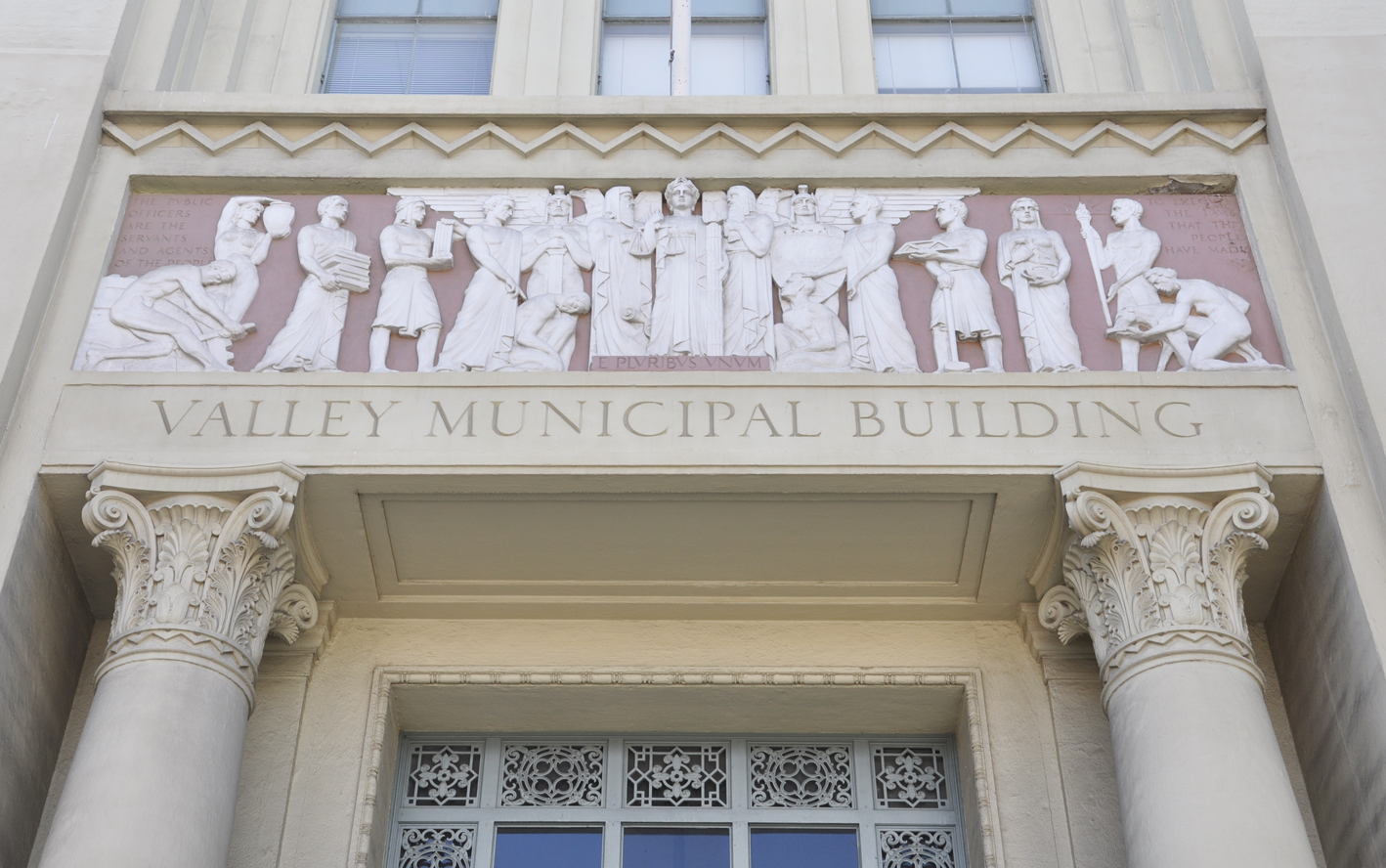 | The Richfield Oil Building was designed by Stiles O. Clements and built from 1928-1929 in downtown Los Angeles. The black and gold, 12-story building was covered with decorative glazed terra cotta. The building was demolished in 1969. These 12-foot-tall, gilded terra cotta figures were installed above the main entrance. They were created by Haig Patigian. Before the demolition, a UCSB professor arranged for them to be saved. They went into storage until 1982 when they were installed where they are today. There were four figures but only three were complete (Industry, Aviation, and Navigation). The Postal Service figure remains in storage. For more, see these websites: 1, 2, and 3. [map] |