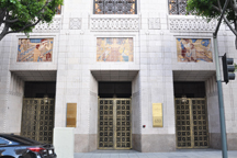 | The Trust Building was built in 1928 for the Title Insurance and Trust Company. The entrance features three polychrome tile murals created by Hugo Ballin. They depict Trust, Protection, and Fidelity. For more, see this website. [map] |