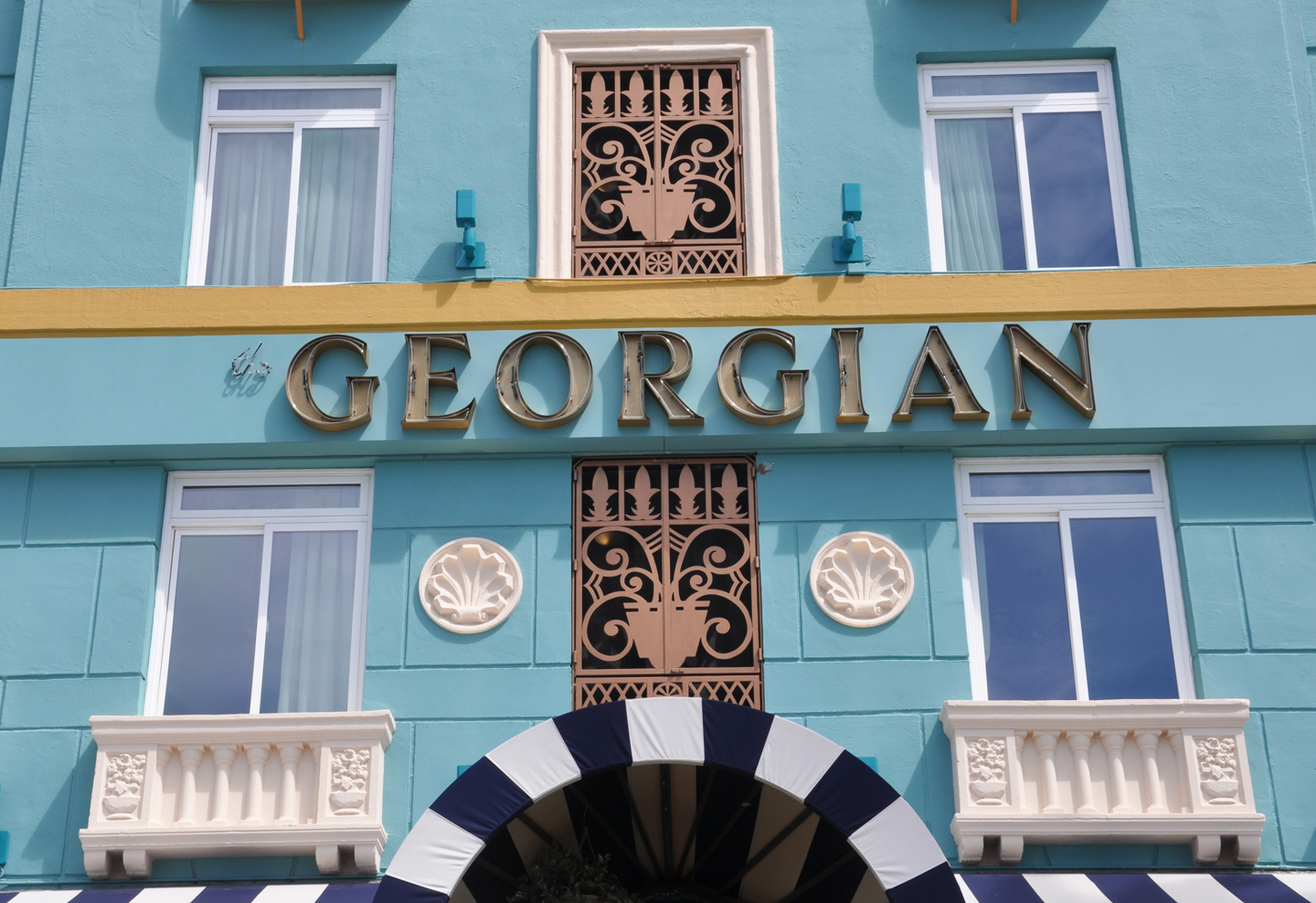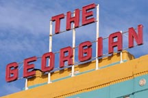 | The Georgian Hotel was designed by M. Eugene Durfee and built in 1931. The rooftop's neon sign has been changed to LED tubing. The letters over the entrance were backlit plastic for many years. In 2023, they were restored with neon. For more, see this website. [map] |