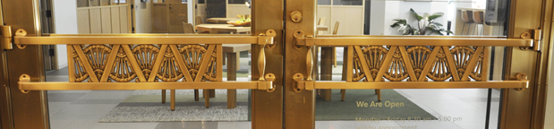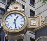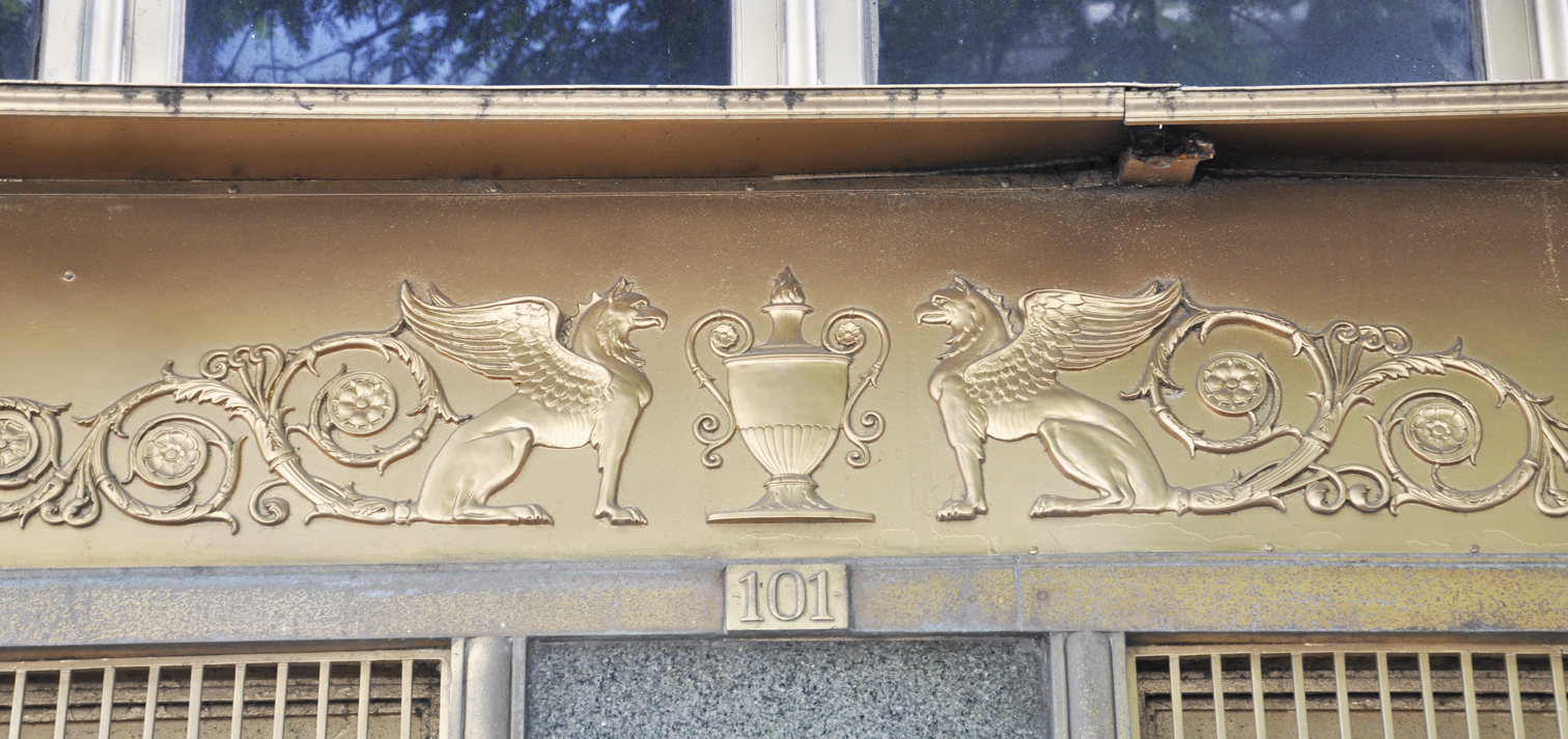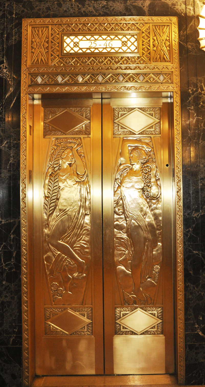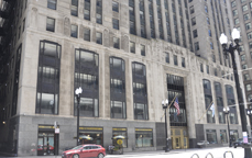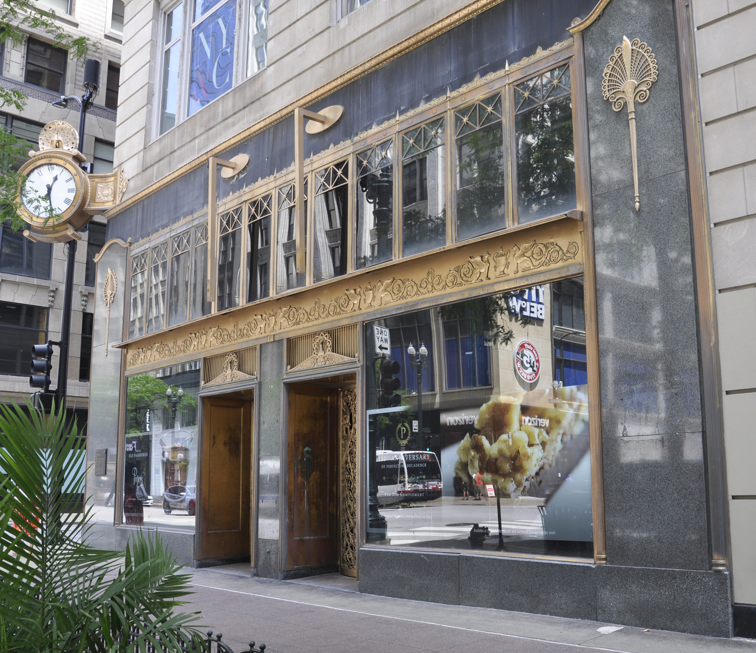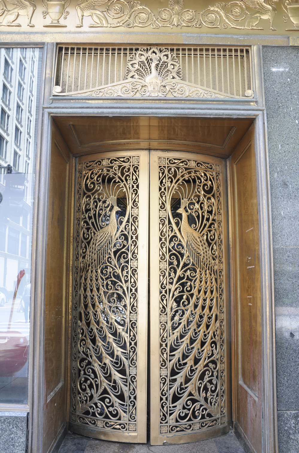 | The Palmer House Hotel was designed by Holabird & Root and built from 1925-1927. The ground floor was occupied by the C.D. Peacock jewelry store. It still has the original bronze clock. The bronze doors were designed by Louis Comfort Tiffany. The building is now known as the Palmer House - A Hilton Hotel. For more, see this website. [map] |