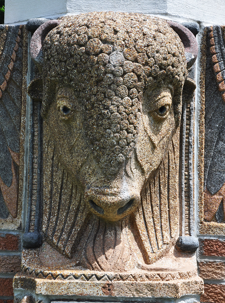 | The Minisa Bridge was built in 1932. The bridge spans the Little Arkansas River and is located next to North High School. The Indian and buffalo heads on the bridge were designed by Bruce Moore. They are detailed with carthalite, a mix of concrete and crushed glass. The bridge was completely restored from 2006-2009. For more, see this website. [map] |