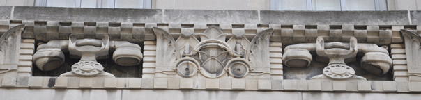 | The Cincinnati and Suburban Telephone Company Building was designed by Harry Hake, Sr. and built in 1930. The building now houses Cincinnati Bell. For more, see this website. [map] |