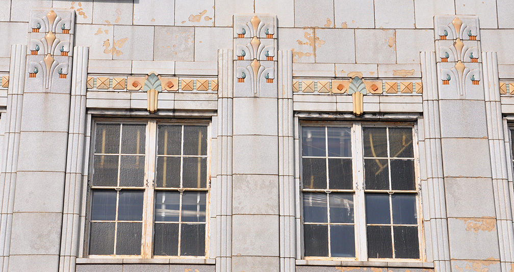 | This Kress opened in 1935. The storefront and interior were updated from previous Kress stores on the same site from 1905 and 1917. The terra cotta facade contains tiny gold flecks. The roughly textured windowpanes were also tinted with gold. The store closed in 1980. Around 2019, the signs at the top and middle of the facade, as well as the individual KRESS letters above the windows, were uncovered. The building is listed on the National Register of Historic Places. It is currently vacant. [map] |