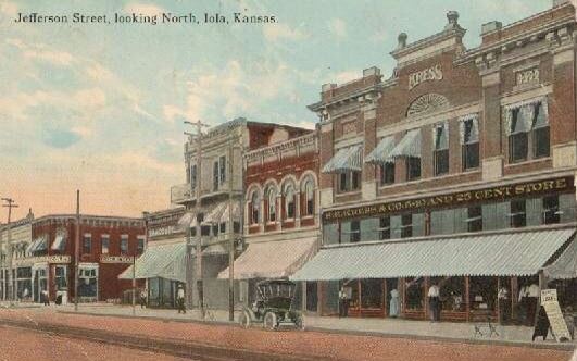 | This Kress opened in 1911, combining two existing buildings. It closed around in the 1950s or 1960s. The building then operated as Raney's drug store until it closed in 1996. The building now houses the Kansas Sampler. [map] |