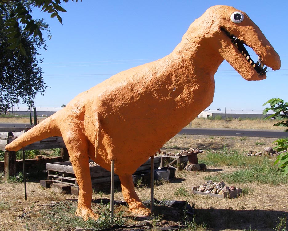 This Dinosaur stood in front of the long-closed Bob's Museum, Gift, & Rock Shop. The museum was originally called Bob's Prehistoric City. I would assume from its mouth that this dinosaur must have originally spoken. In 2009, this dinosaur was removed. It is supposedly located in Jerome, ID in the backyard of the artist that made it. For more, see this website.