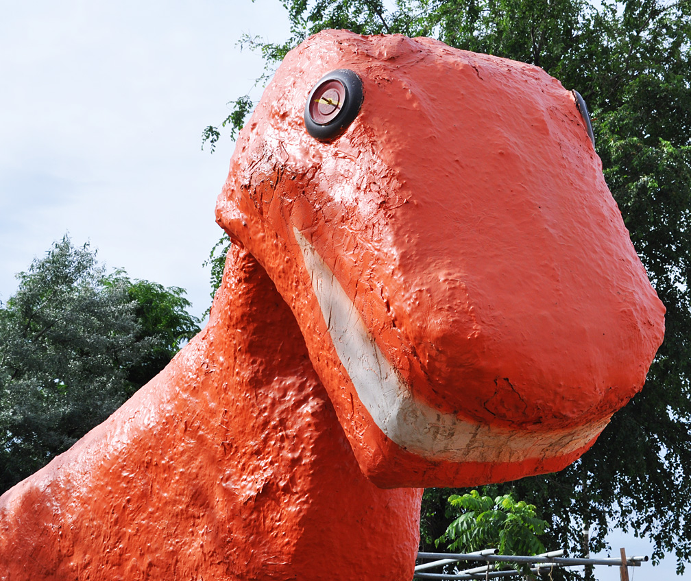 This Dinosaur is located at the Snake River Rock Shop. He appears to be made of cement and is well cared-for. The statue was originally painted black. Between 2008 and 2014, the statue was repainted. His mouth was filled in with cement to keep animals out of it. [map]