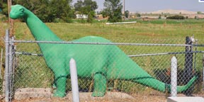 | This Sinclair Dinosaur statue in Jensen was surrounded by chain link fencing at a Sinclair station. This photo is from 2012. By 2018, the gas station was closed and the statue was gone. |