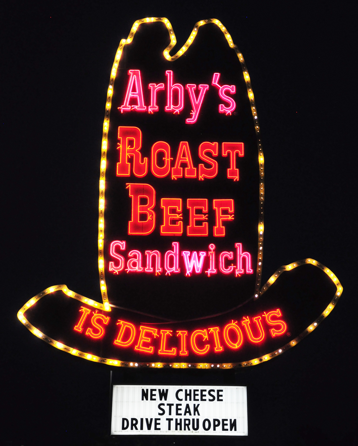 The Arby's sign in Bartlesville was replaced with a plastic version by 2023. This Arby's sign in Miami was previously installed at a location in town. In 2022, it was replaced with a plastic sign and this one was moved to the Allen Sign Studio where it is displayed. [map] |