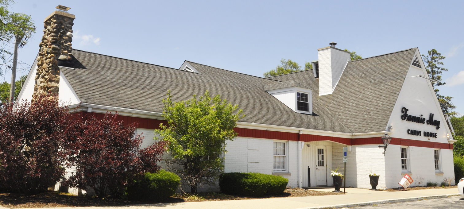 Fannie May Candies is a chocolate and candy store chain, founded in Chicago in 1920. By 1935, there were nearly four dozen shops in Illinois and nearby states. The chain later opened other stores in Indiana, Ohio, Michigan, and Wisconsin. This building in Lansing featured the chain's standard white porcelain enamel exterior with red and white awnings. The building was demolished around 2020.