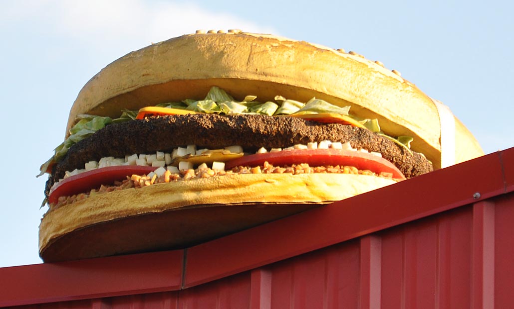 | Vicco's Charcoalburger Drive-in opened in 1953. The giant hamburger on the canopy was added sometime in or after 2011. This photo is from 2012. By 2018, the burger was gone and a Sinclair dinosaur statue was on the roof. [map] |