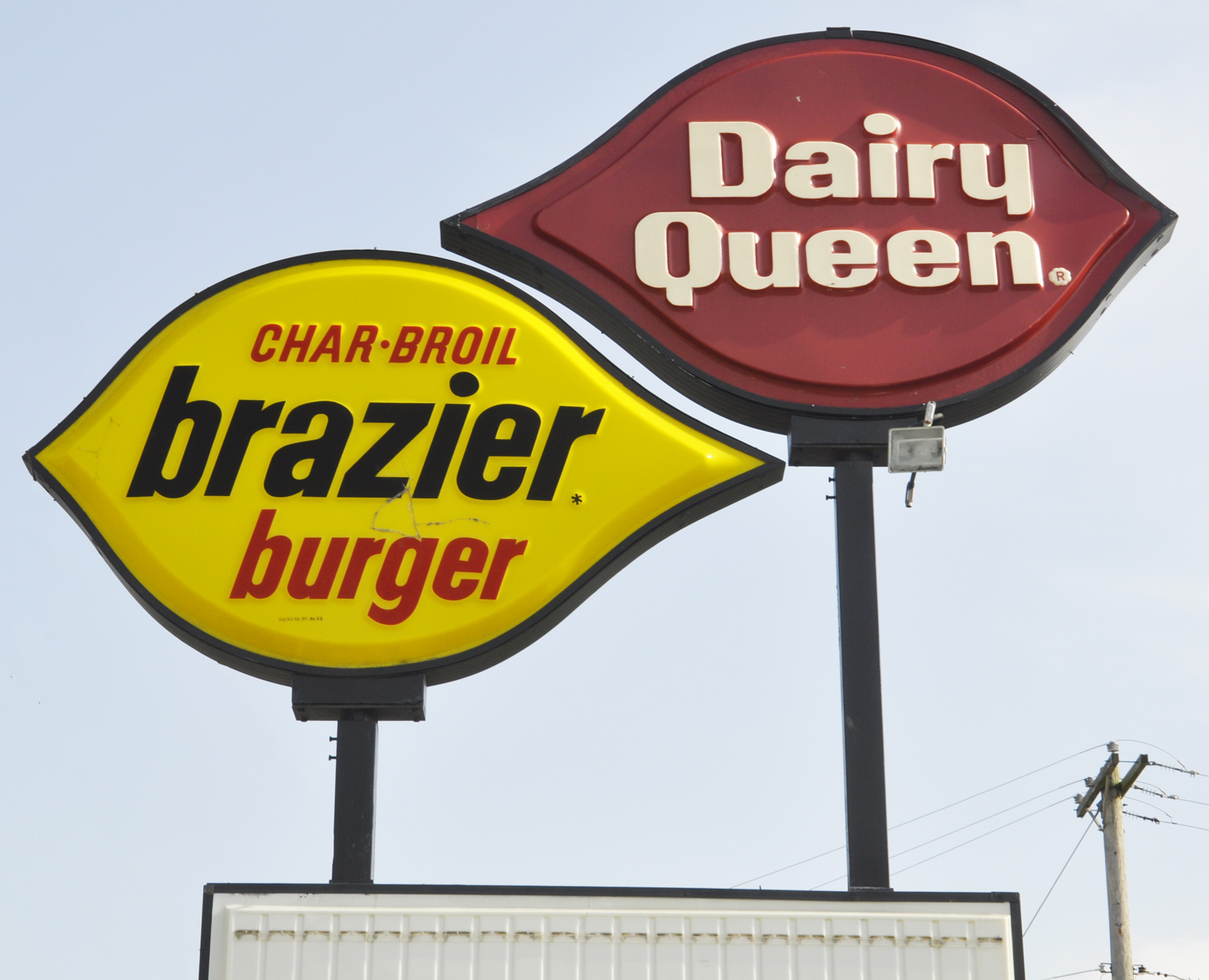 The Andover location closed around 2013. Since 2016, the building has housed Dairy Oasis. The Dairy Queen sign is gone but the weathervane remains. The Athens location had closed by 2017 and the weathervane is gone now. [Andover map] Slanted sign poles like the one that was in Andover are now very rare. The slanted pole signs in Bay City and Stephenville have readerboards between the pole and the lips sign. I don't know how common this was with slanted pole signs or if it was a regional thing. The Bay City sign was replaced with a modern swoosh sign in 2019. [Bay City map]; [Stephenville map] The panels of the slanted pole in Stamford, CT were replaced with the modern logo in 2015. The slanted pole is still there. There is another slanted pole in Marlborough, MA which has been updated with the modern "swoosh" logo sign panels. There is another one in South Milwaukee, WI. However, that location closed in 2019 and now houses Better Together Coffee. The Dairy Queen sign panels were removed but the pole remains. There were evidently pairs of slanted sign poles like this one in Metropolis, IL which are gone now. There were also thinner poles as well like this one in Fort Worth, TX which is also gone. There is a slanted pole in Plano, TX with "DQ" sign panels. There are other slanted poles in Romeo, MI, Vernon, NJ, and Columbia, PA. This Dairy Queen in Topeka has a slanted sign pole but the original panels were replaced with modern logo panels in 2016. This location had opened by 1968. [map] This former Dairy Queen sign in Albuquerque is located in the sign yard of Southwest Outdoor Electric. The Dennis the Menace comic strip character was used in Dairy Queen advertising from 1971-2001. I don't know of any other signs like this left. For more, see this website. This Dairy Queen sign in Elwood might be the only example left of these 1960s double lips signs. [map] The photos of the Shinnston location are from 2012. By 2013, the location had closed. The building is still there but the weathervane and sign are gone. |
