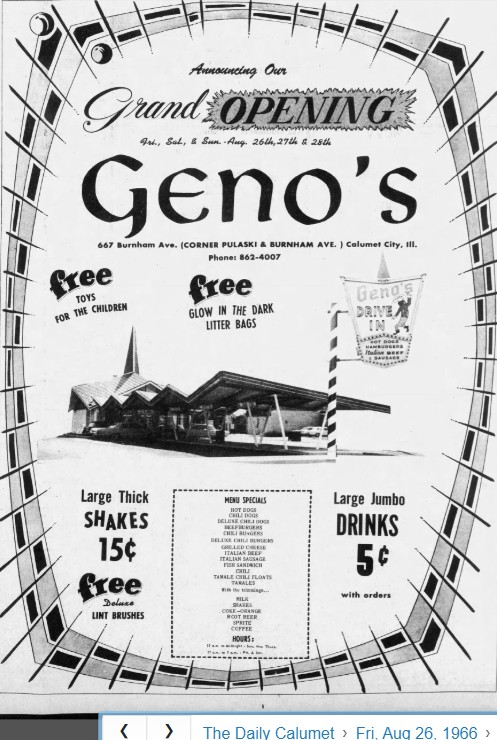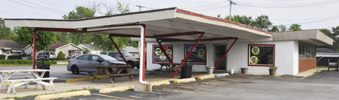 Geno's Drive-in was built in 1966. It later housed Mike & Dot's Drive-in. It last housed Big Daddy's Patio which had closed by 2016. The building remains vacant. For more, see this website. [map]