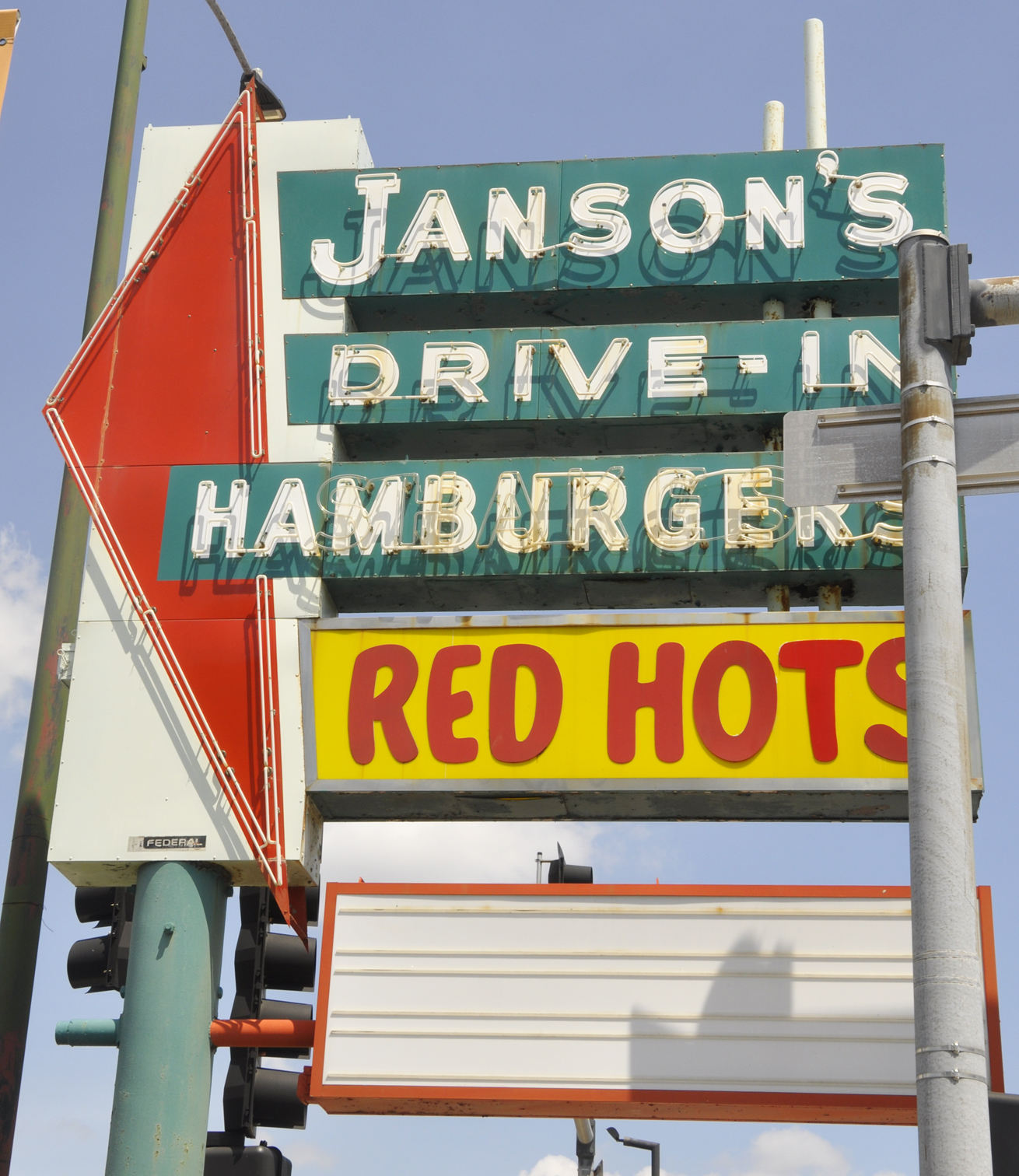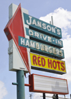Janson's Drive-in opened in 1960. It is a walk-up restaurant with no indoor seating or car hops. The neon alternates between "Hamburgers" and "Shakes" at night. In 2012, new owners began renovating the place. It reopened in 2014. For more, see these websites: 1 and 2. [map]