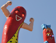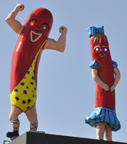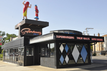 The Superdawg Drive-in opened at this location in Chicago in 1948. It features car hops and a pair of 12-foot-tall winking hot dog statues on the roof. The statues are named Flaurie and Maurie. In 1999, a dining room was added and new canopies with neon were built. The statues were also refurbished. In 2024, the statues were removed and restored again. For more, see these websites: 1 and 2. [map]
