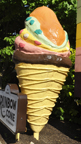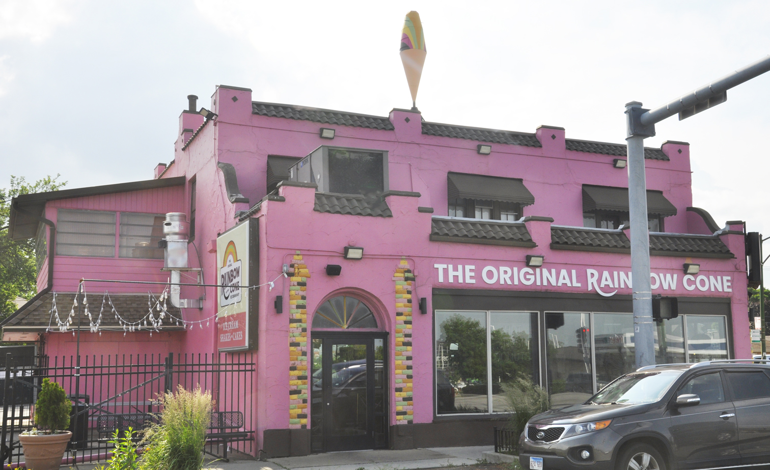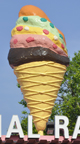 This Original Rainbow Cone in Chicago opened in 1926 as the first location. Their five-flavor Rainbow Cone features layers of chocolate, strawberry, Palmer House (a cherry-nut blend), and pistachio ice cream, and topped with orange sherbet. They also sell other ice cream concoctions and sandwiches. By 2009, a different ice cream cone statue was installed on the roof. For more, see this website. [map] |