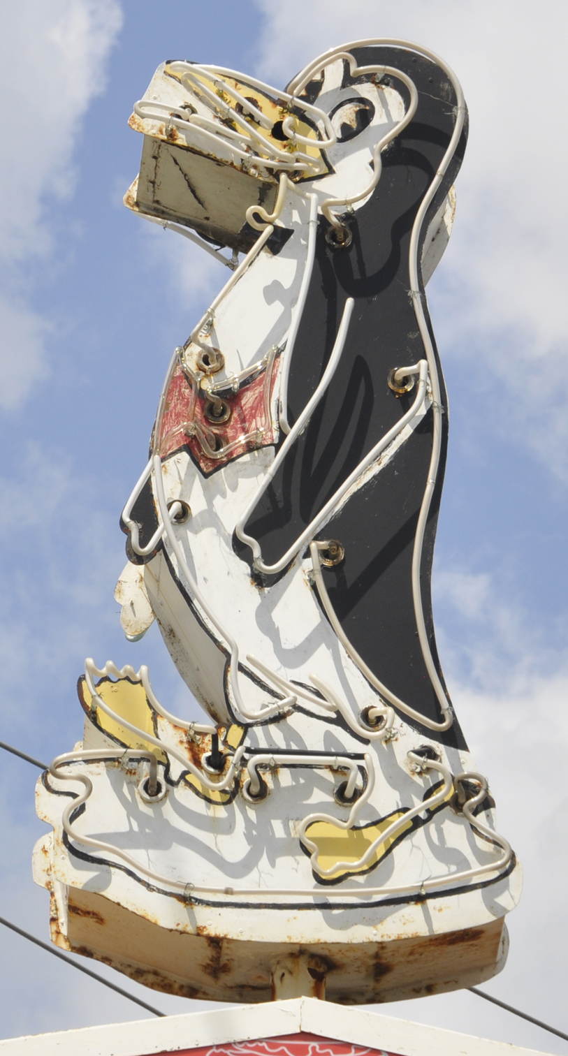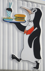 | This Elkhart location featured a neon penguin on top of its plastic sign. This guy has yellow feet while the one shown below in Plymouth had red feet. This location closed in 2022. The sign was adapted for the Food Shack. The penguin remains. [map] |