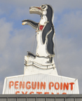 | This seven-foot-tall sign at the Penguin Point corporate office was built in the mid-1960s and installed on roof. Despite the company closing in 2023, this sign remains. The paint is beginning to fade and the metal is starting to rust. [map] |