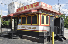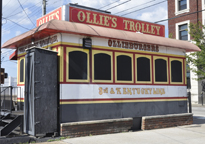 | This Ollie's Trolley was the first one built, opening in 1973. Soon after that, other locations opened in Memphis, Nashville, and Atlanta. By 1976, there were more than 100 locations including a double trolley in Windsor, ON. These small, trolley-like buildings are take-out only. Windsor, ON. However, the chain was defunct just a few years later. The only other still-operating location that I know of is in Cincinnati, OH. These small, trolley-like buildings are take-out only. [map] |