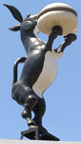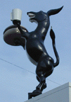 This Hazel Park location originally went by Bray's name. In the 1970s, the chain was taken over by Gordon Bray's son, Phil Bray, who owned it until the 1980s. After that it was taken over by Gordon Bray's other two sons: Marc (who owned the Hazel Park location) and John (who owns the Westland location). The Hazel Park location's name was changed to "Bray'z Hamburgers" in the 1990s. The donkey holding a burger and cup on the roof is part of the chain's original design. The 10-foot-tall statues were produced by Ben Robinson of the Plycrete Mold Co. The original sculpture from which the mold was made was created by Elmer Johnson. [map] The only other "Brays" donkey statue left on public display is in Westland, MI. Although the building was replaced, the rooftop donkey was saved. Buster is now displayed inside. |