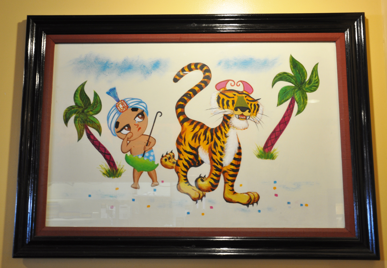 | The Sambo's Restaurant chain was founded in 1957. The restaurant's name came from an abbreviation of the owners names: Sam Battistone and Newell Bohnett. However, the chain quickly became associated with the story of Little Black Sambo. The restaurants were decorated with scenes of the Indian boy and Tigers. By 1979, there were about 1,200 locations nationwide. In the late 1970s and early 1980s, lawsuits and political pressure led the company to change its image. However, the rebranding was unsuccessful. By 1982, there was only the original location in Santa Barbara, CA left. For more, see this website. |