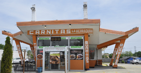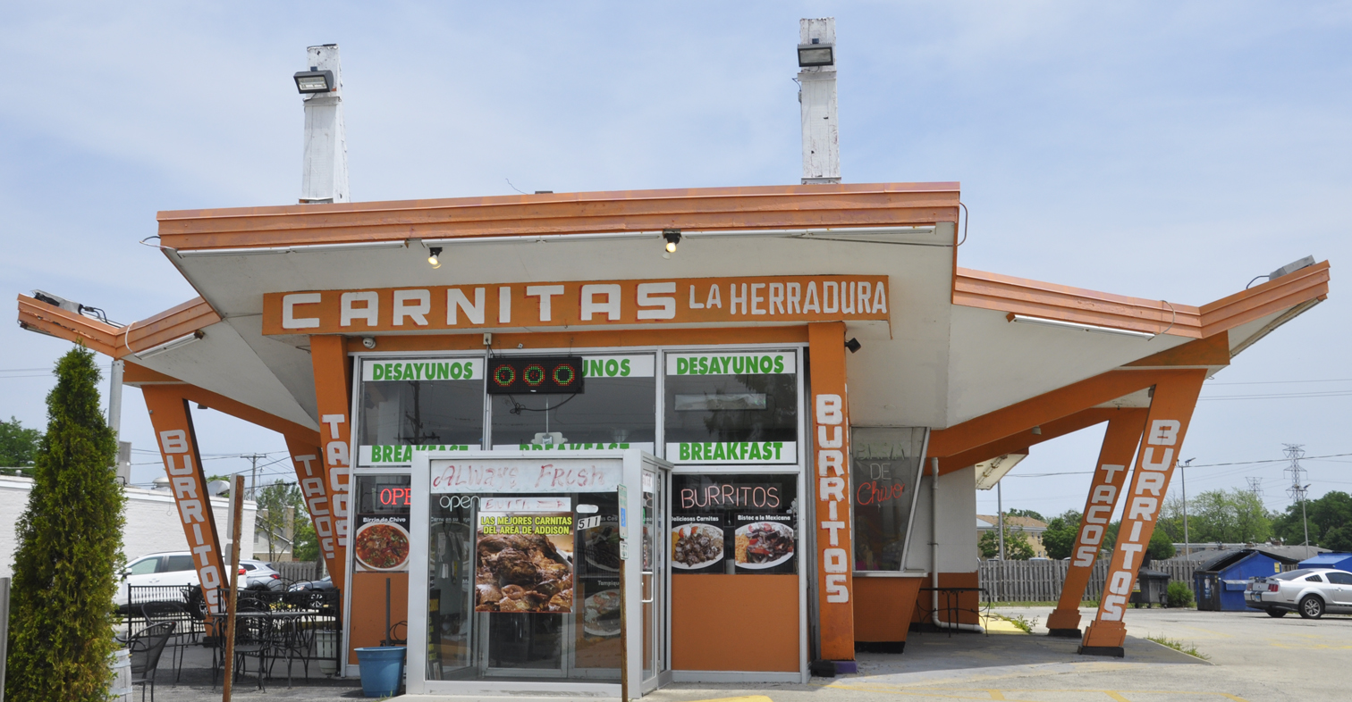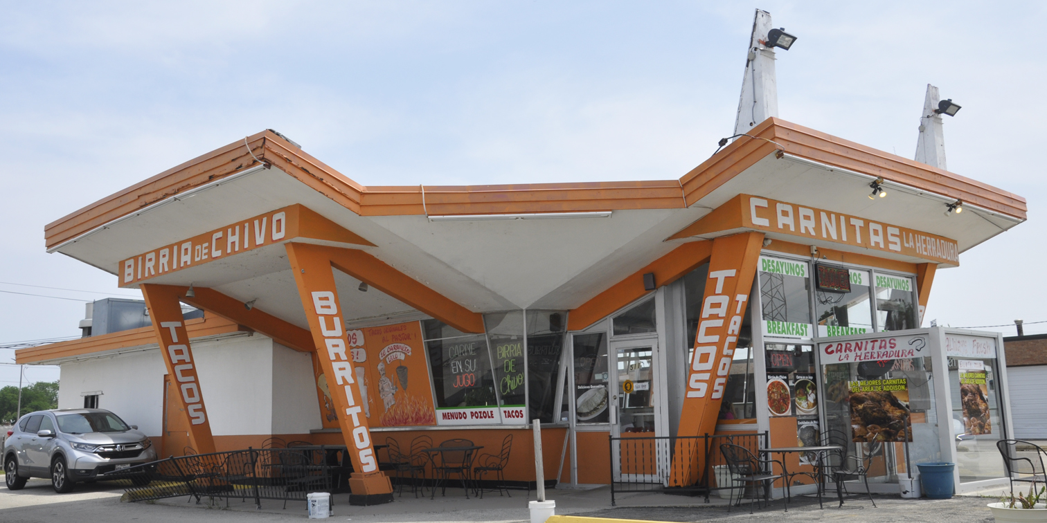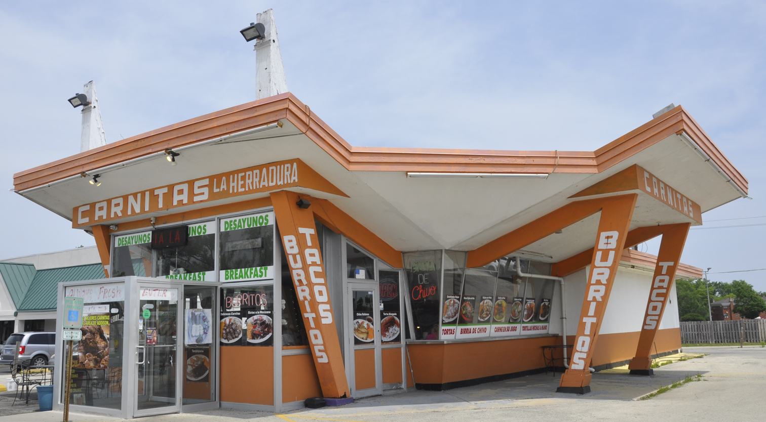 | This former Sandy's Hamburgers was probably built in 1963 and closed around 1973. The building now houses Taqueria La Herradura. The building is painted orange and white. For more, see this website. [map] |
