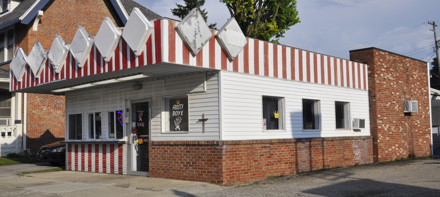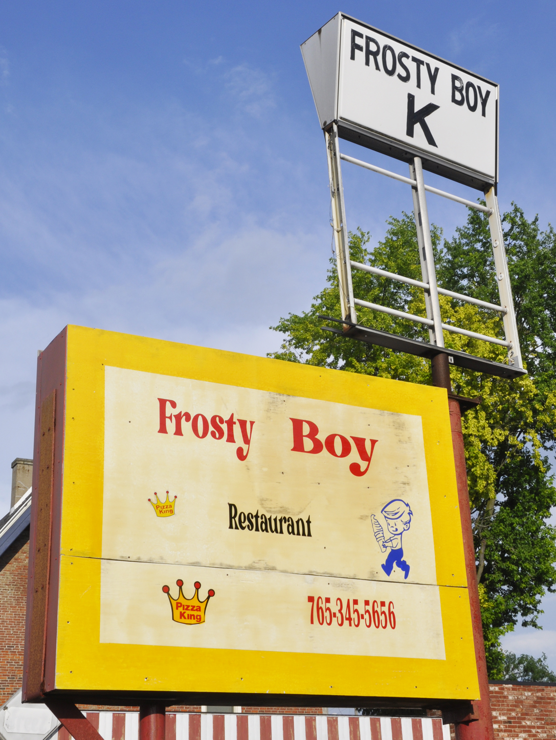 | This former Tastee-Freez in Knightstown was built in 1967. By the 1970s, it was known as Tastee Cream. I don't know when it became Frosty Boy K. Evidently, this stand was connected with the Pizza King and Frosty Boy chains. In 2024, the stand was nearly destroyed by a fire. It has reopened. The Tastee diamond signs have been painted over but the blue glazed brick remains on the left side of the building. For more, see this website. [map] |