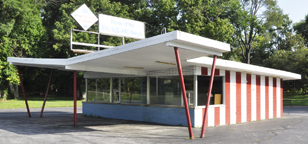 | The buildings below are examples of Tastee-Freez's glazed, blue brick design. The buildings had red and white stripes in front and distinctive diamond shaped signs. |