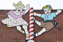 The Kiddieland sign was built in 1950. It featured a boy and a girl clinging to a giant peppermint stick which used to spin. The children had neon installed on only side to create the effect of them chasing one another at night. When the park closed, the sign was put up for sale but it did not find a buyer. It wound up being donated to the Melrose Park Historical Society. In 2012, parts of the sign were installed in the Melrose Park Library parking lot. The neon was removed by the Society. Bulbs were added and some repainting was done. For more, see these websites: 1, 2, and 3. |