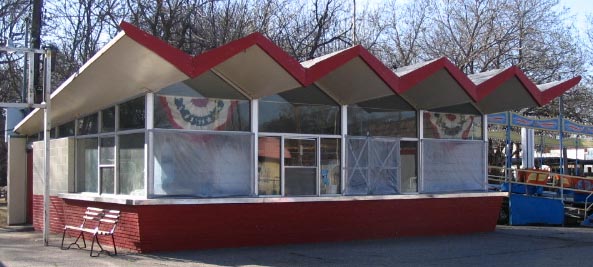 | Joyland was mostly an old-fashioned amusement park but it did have a fairy tale section. Joyland opened in 1949 and this sign was built around that time. There were old kiddie rides, a dilapidated Frontier Town, and a dark ride called the Whacky Shack. There were also old coin-operated rides like the rocket shown above and two trash cans (clown and pig). The bottom photo shows an old concession stand. The Shoe House was originally at Kiddieland in Wichita and moved here to the "Mother Goose Garden" when the two parks were combined in the 1960s. Joyland closed in 2004 and was reopened in 2006. At that time, the sign was repainted blue and purple (see second photo above). It closed again shortly after that. In 2011, a group was formed to raise money for the restoration and reopening of the park. However, the group disbanded in 2014. That same year, the neon sign and other items were removed and put in storage. The Historic Preservation Alliance of Wichita plans to restore them. For more, see these websites: 1, 2, and 3. [photos thanks Glenda Campbell] |