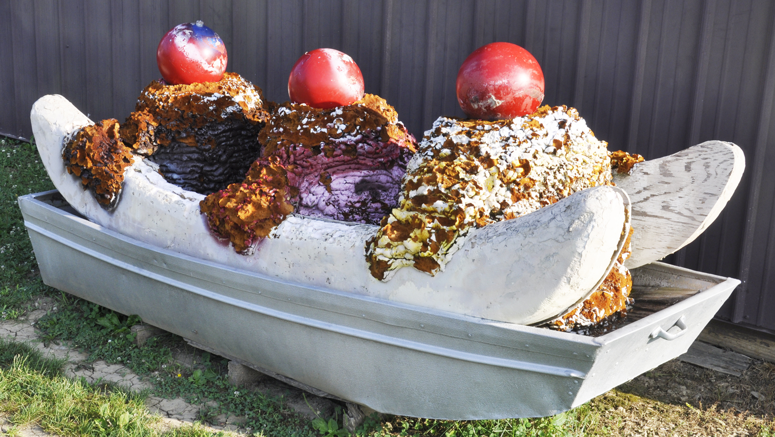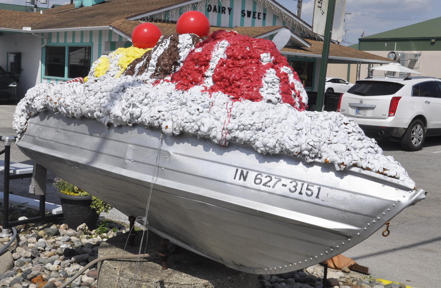 | This Ice Cream Sundae in a boat has been installed in front of the Dairy Sweet since at least 2009. [map] |