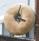 There was another Giant Bagel in San Francisco. The Giant Bagel in Indianapolis was installed at the Ripple Bagel & Deli around 2003 when the store opened. The bagel has operating clock hands. [map] |