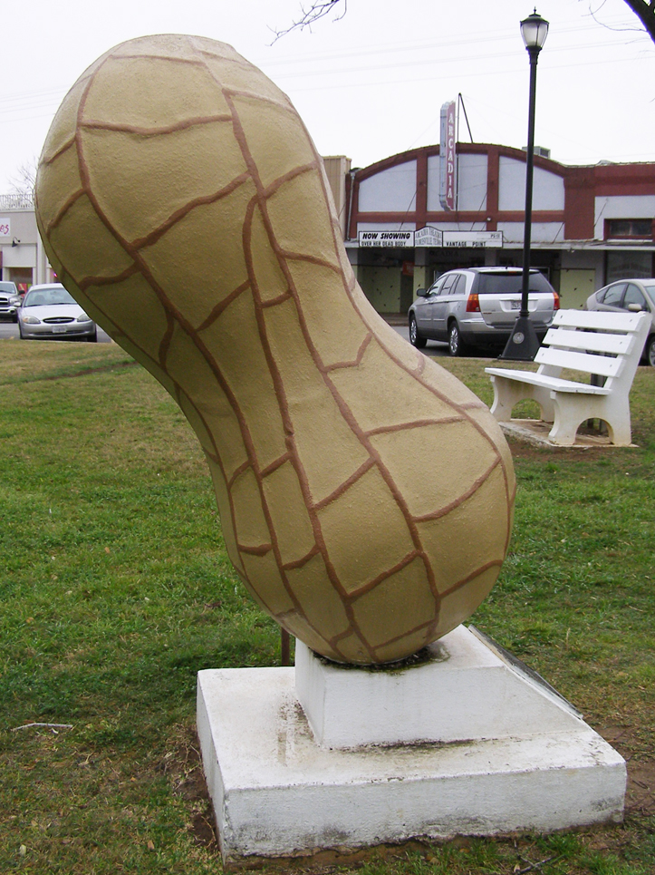 The Giant Peanut in Floresville is about six feet tall and was created in 1970. It is installed in front of the Wilson County Courthouse. For more, see this website. [map] The Jimmy Carter Peanut is 13 feet tall and was constructed in 1976. The smiling peanut was produced in Indiana for President Carter's presidential campaign visit to Evanston, IN. After the visit, it was brought to Plains, GA which is Carter's birthplace and home. It is installed in front of the Davis E-Z Shop, a gas station/convenience store. For more, see this website. [map] |