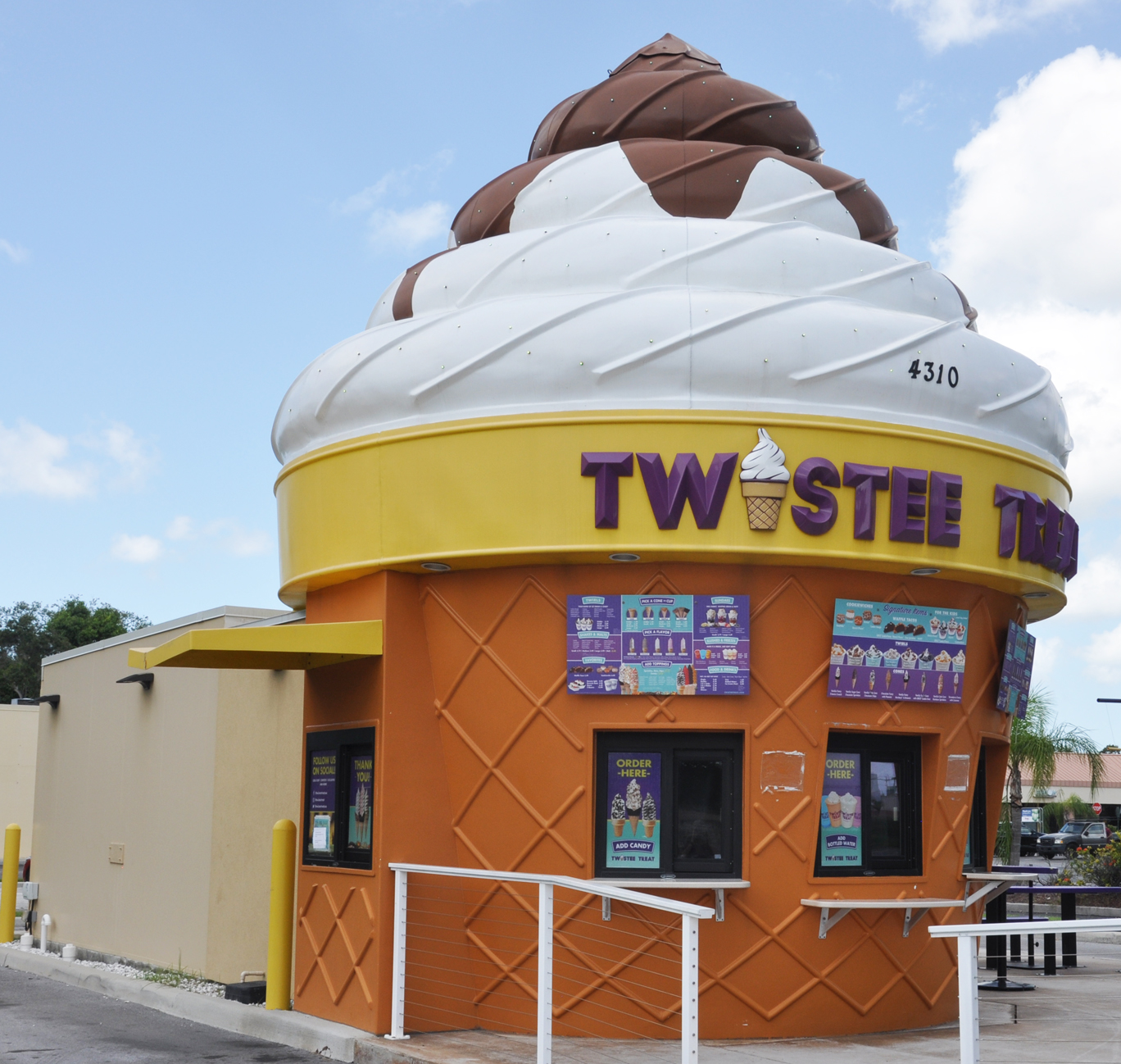 The vintage Twistee Treat on S. Orange Blossom Trail has been painted half chocolate and half vanilla. [map] The vintage Twistee Treat on International Dr. was installed there around 2008. It was previously at another location in Orlando. Before that, it may have been located in Canada. [map] The Twistee Treat on Curry Ford Rd. opened in 2010. It was the first modern building. [map] There is another new location in Orlando on E. Colonial Dr. |