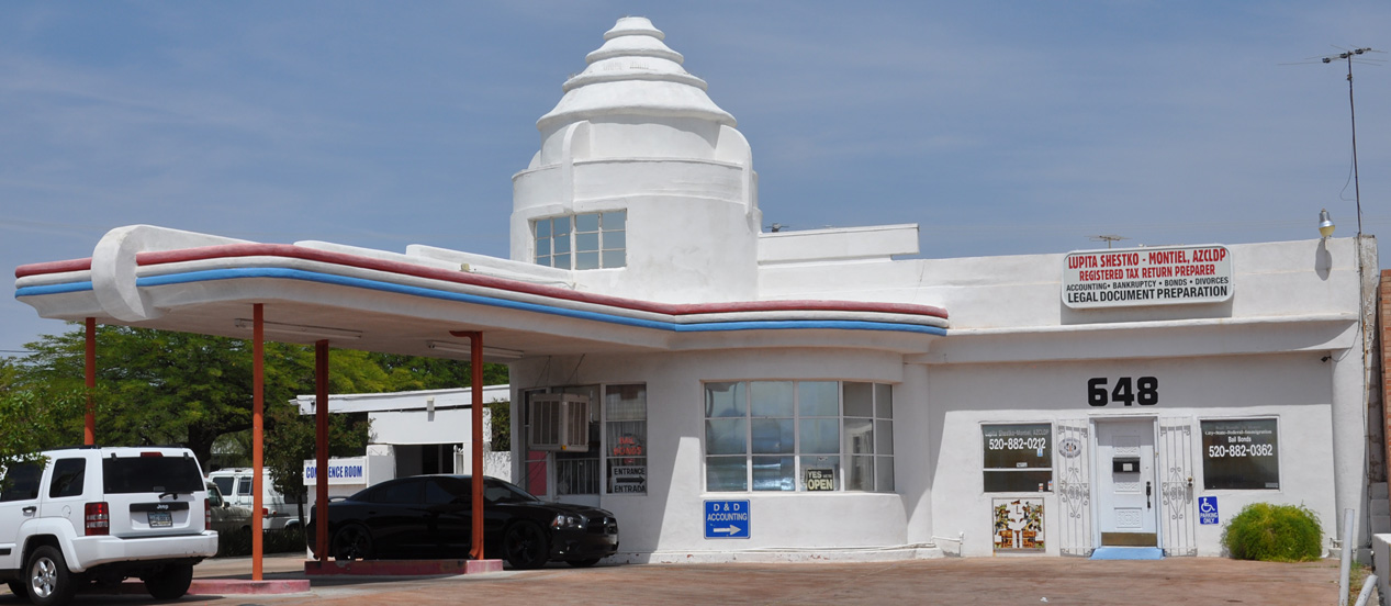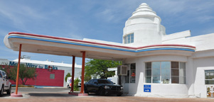| This former station was designed by Cecil H. Moore and built in 1936. In later years, this station housed an Exxon, and Shell and a 76 station but I don't know what brand of gas was sold here originally. Since 1981, the building has been used as an accounting and law office. For more, see these websites: 1 and 2. [map] |