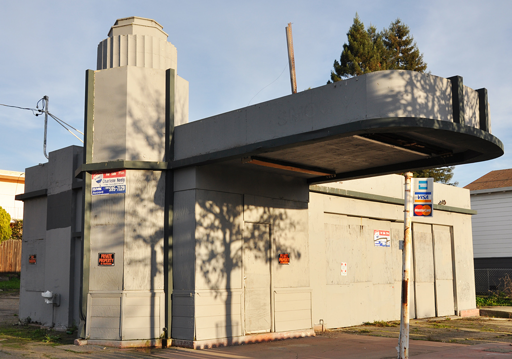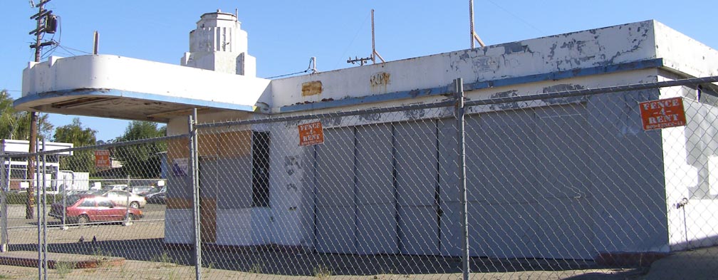 | This former station also has a rounded canopy with fluorescent tube lighting like those above. The canopy on the side of the building was probably added later. However, the front of the building looks very similar to the Seaside stations shown at the top of this page. The building last housed Laguna Motor Werks. The shop closed in 2022 after a fire but may reopen. I don't know if the Streamline Moderne building behind the station was always used for service bays. [map] |