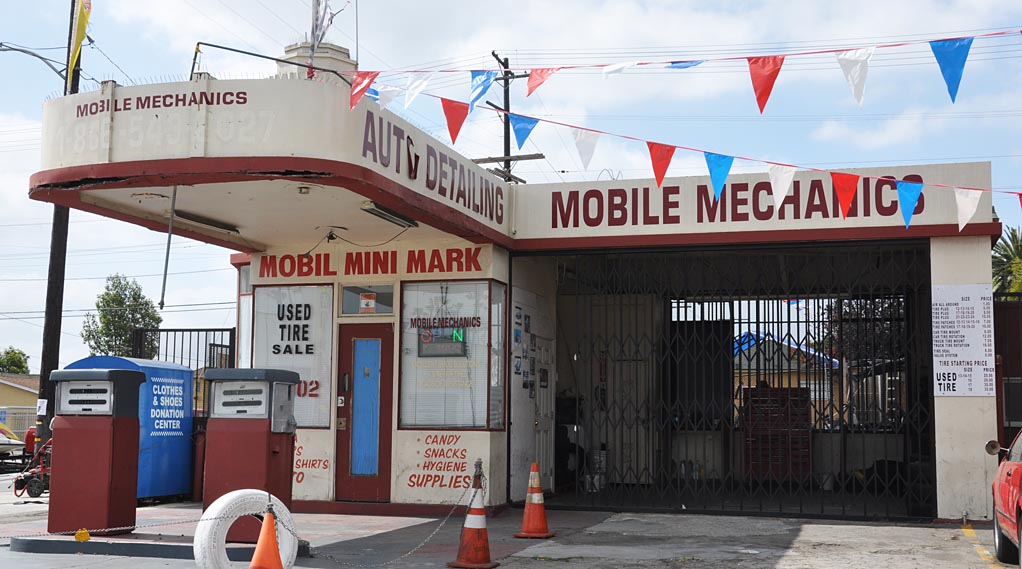 | This former Flying A station housed Mobile Mechanics when this photo was taken in 2013. The canopy was missing its support poles. By 2014, the building had been painted green and was housing Yshua Smog & Collision Repairs. By 2016, the building was housing J&B Alarm & Stereo. By 2018, the building was painted blue and gold and was vacant again. It now houses a jet ski sales business. [map] |