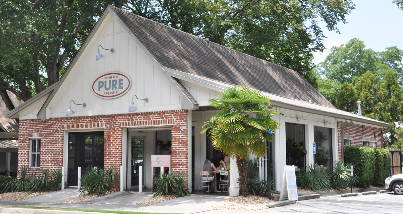 | This former station in the top row might be from the 1920s. I don't know if there was a canopy there originally. The building in the second row is modern, built to look somewhat like a Pure Oil station. It has housed the Pure Taqueria since 2005. The smaller building is used for storage. [map] |