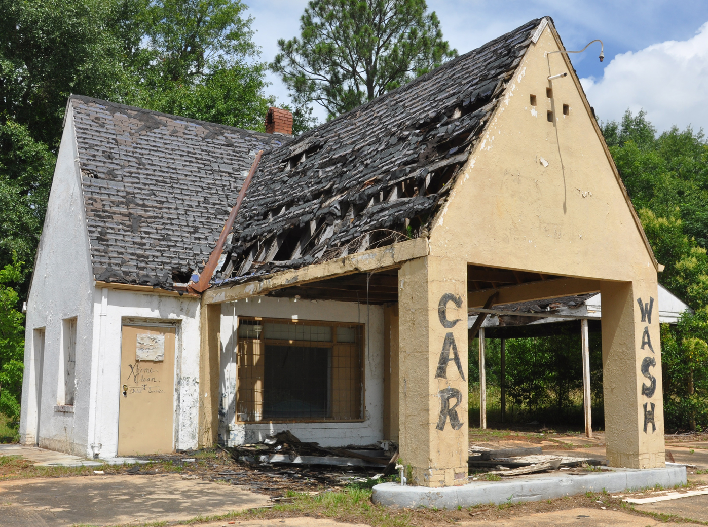 | This former Texaco station now houses a car wash. The round window on the left of the building would have had a Texaco logo originally. [map] |