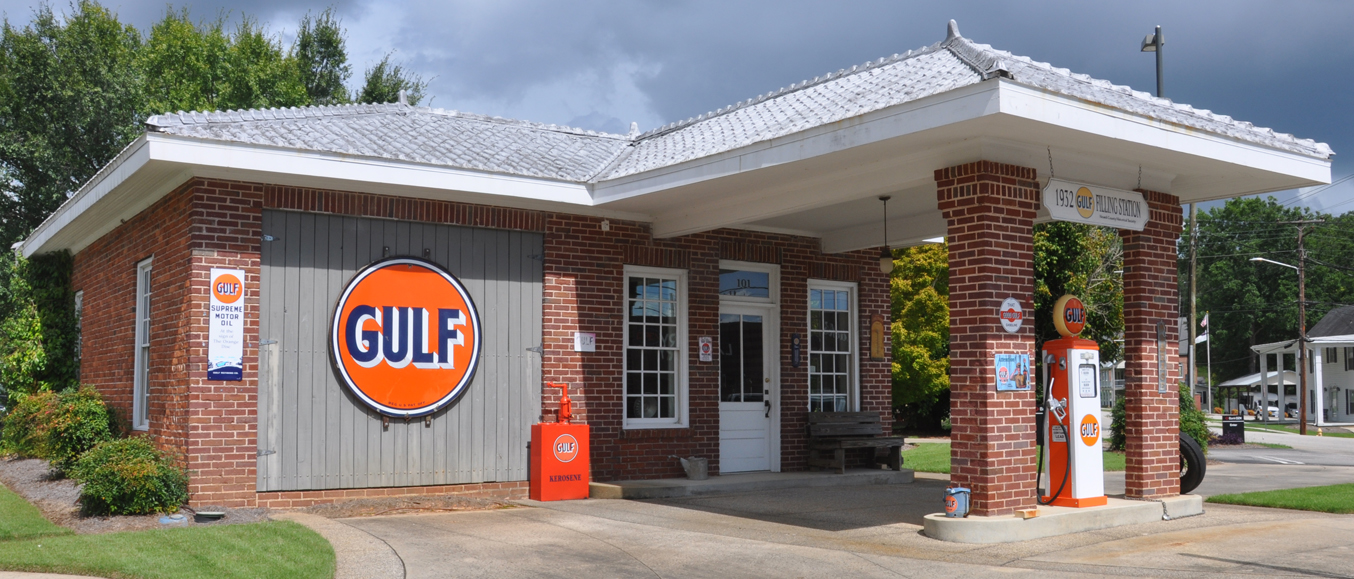 | This former Gulf station was built around 1932. The building was restored around 2017 by the Heard County Historical Society as the Filling Station Museum. The replica pumps and signs were installed then. There is local historical memorabilia inside the office. [map] |