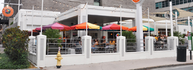 | This Texaco station was built in 1937. The building was restored around 2008 and began housing a Vespa dealership. In 2016, it was housing a bakery and pizza restaurant. Since 2021, it has housed Zunzi's, a South African inspired restaurant. Posts and a low wall were added around the outdoor dining space at that time. [map] |