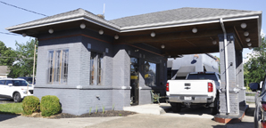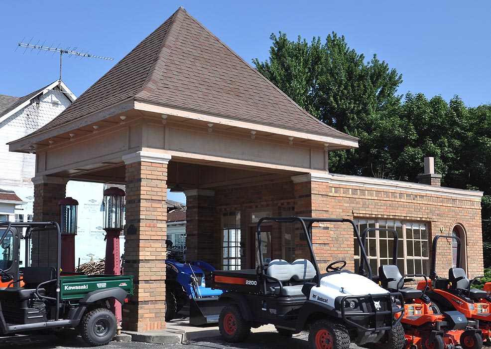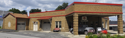 | This former station appears to be from the 1920s or 1930s. This canopy appears to have been added later. The building now houses a used car dealership. [map] |