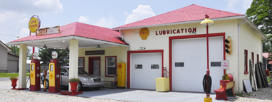 | This former station has Marathon and LINCO gas pumps on display. I'm not sure if they are restored or replicas or if they are any indication of what brand(s) of gas were previously sold here. This building is now used as a visitors center. [map] |