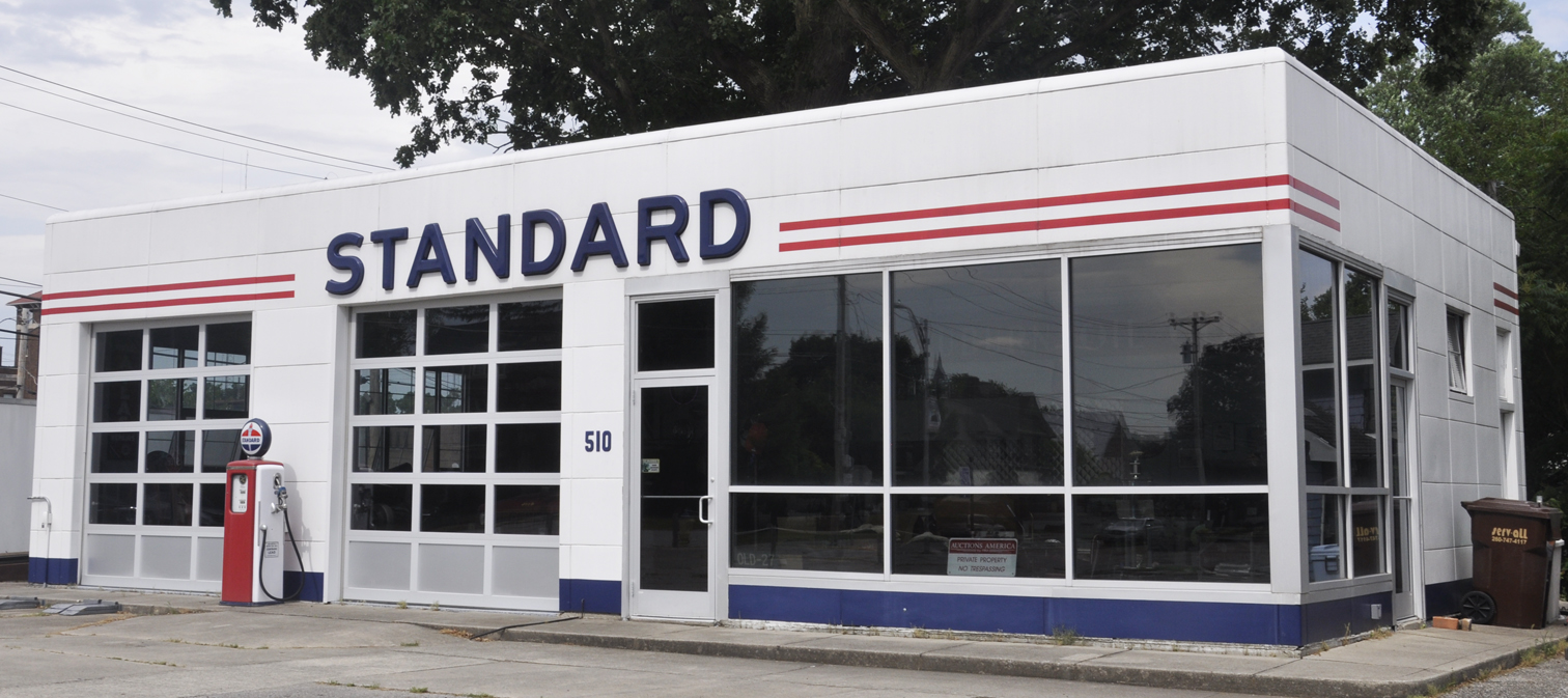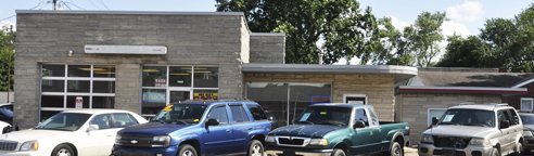 | This former station's limestone facade seems to be original. There is an inscription on the side of the building that reads "Zaharako 1958." That's most likely when this station was built. It was probably owned by the family that owned Zaharako's Confectionery. The building is now used for a used car lot. [map] |