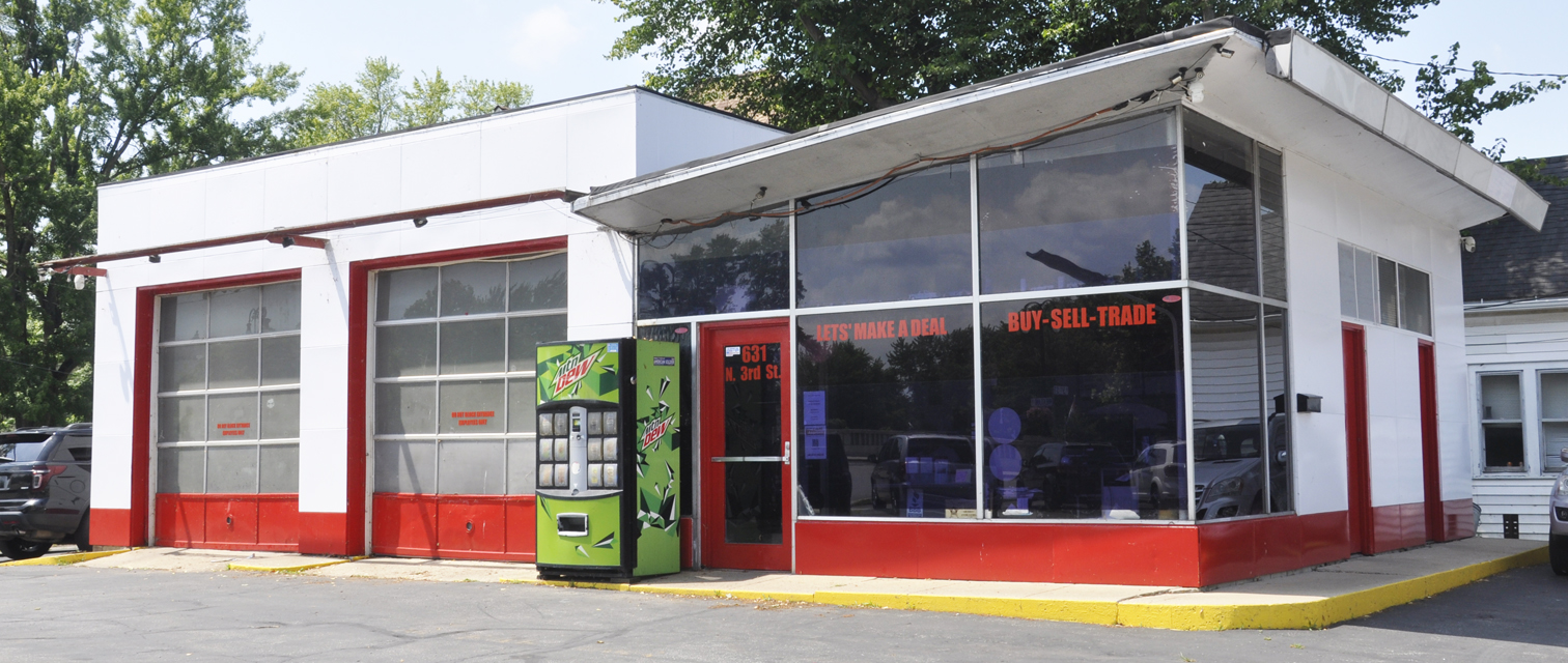 | This former Marathon station was a service garage for many years. In 2018, it was housing a used car lot office. [map] |