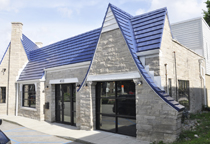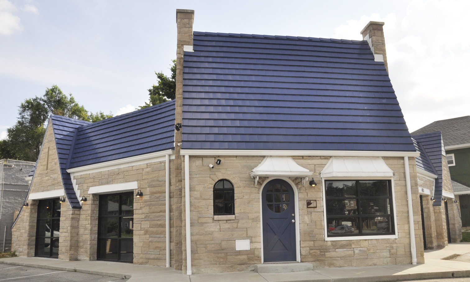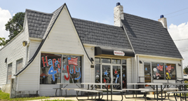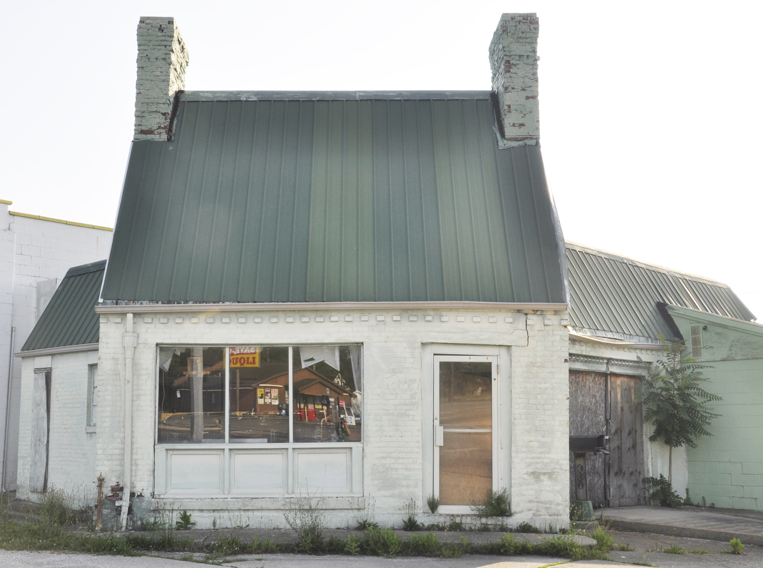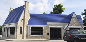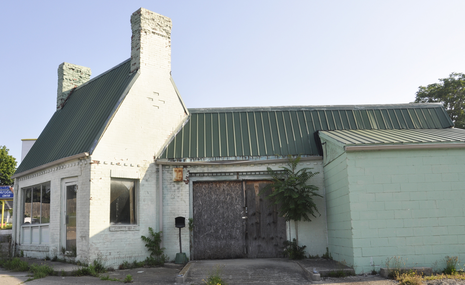 | This former Pure Oil station was built in the 1930s. The building had been vacant for many years. From 2019-2022, new owners purchased the building and began restoring it. The building is now called the Blue Roof and houses coworking space for a real estate company and a few other businesses. [map] |