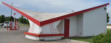 | This former Vickers station features a parabolic roof. Vickers Petroleum developed this design in 1954. This concrete structure withstood a tornado while buildings around it were heavily damaged. It recently housed an information center and Chamber of Commerce for many years. The building now houses the Haysville Economic Development office. [map] |
