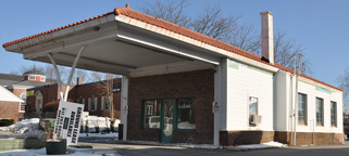 This former station housed Action Press when this photo was taken in 2010. By 2016, the building had been remodeled. The canopy was removed and the tiles were missing from the roof. The building now houses a pizza parlor, a locksmith, and a constable's office. [map]