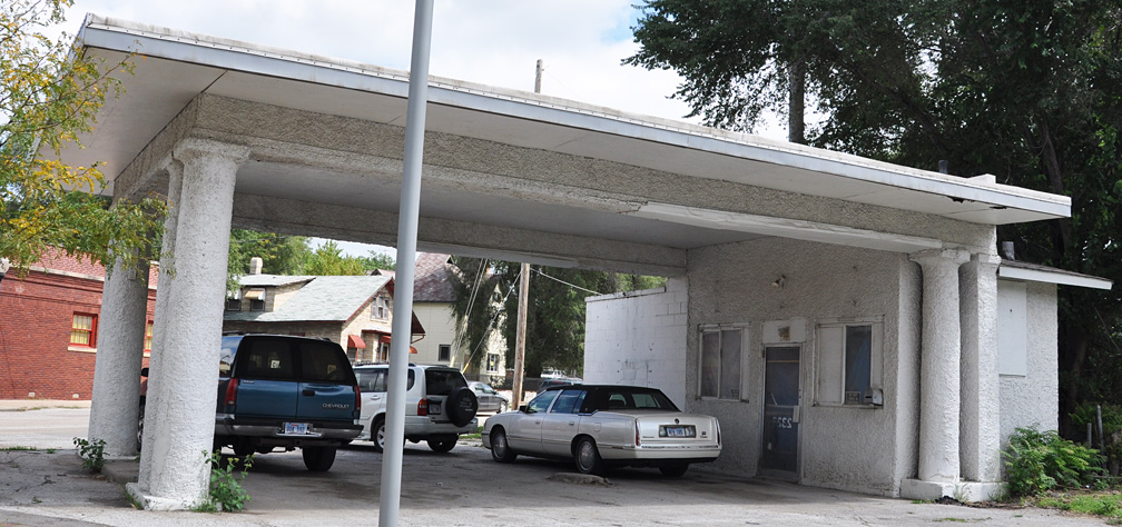 | The Shady Bend Tourist Haven was established in 1929. The complex featured 33 cottages, each with an enclosed garage. There was also a trailer camp, a cafe, tennis courts, and a buffalo herd. All that remains of the complex is this gas station building. It was originally a Phillips 66 station. The building was also used as a store, restaurant and tavern. It closed in 1990 and was vacant until 2008 when restoration began. In 2011, the building began housing Italian restaurant and bar known as Doc & Fritz's Shady Bend. That business closed and the building was vacant again. Since 2018, it has housed the Shady Bend Cafe. For more, see this website. [map] |